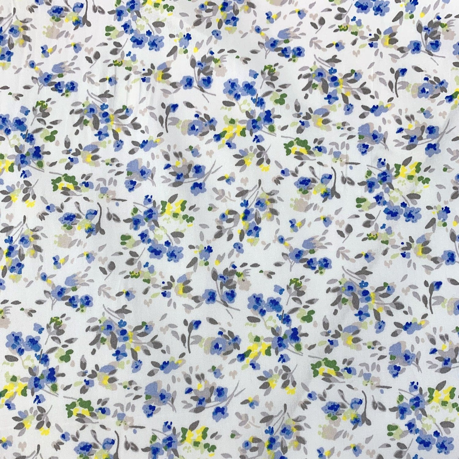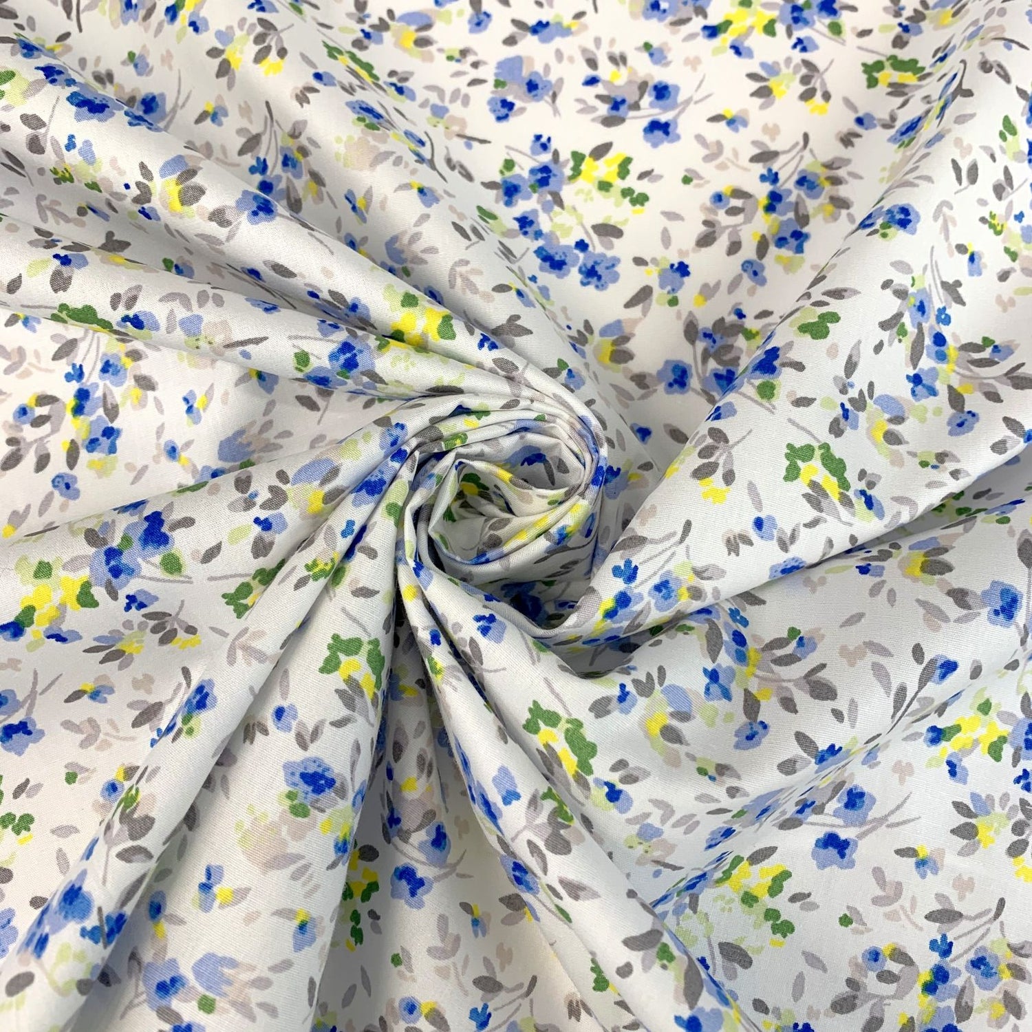 113cm wide superior quality cotton poplin in an all over floral print in blue, yellow and grey. This fabric is superb for dresses, crafts and light furnishings.