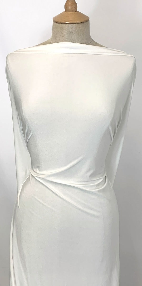 Superb quality stretchy knitted dress fabric in white. Great for lining. A lightweight jersey lining fabric for when you want a dress lining with some give. Approximate stretch in the width 60% and length, 25%. This fabric does not ladder and can also be used for tops and dresses when used doubled up.