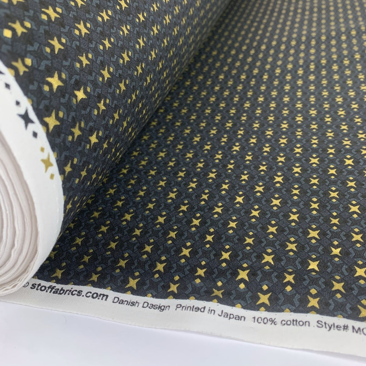 Designed in Denmark and printed in Japan. Superb quality Stof Japanese craft cotton with a Christmas print of gold stars on a geometric pattern in black and dark grey.