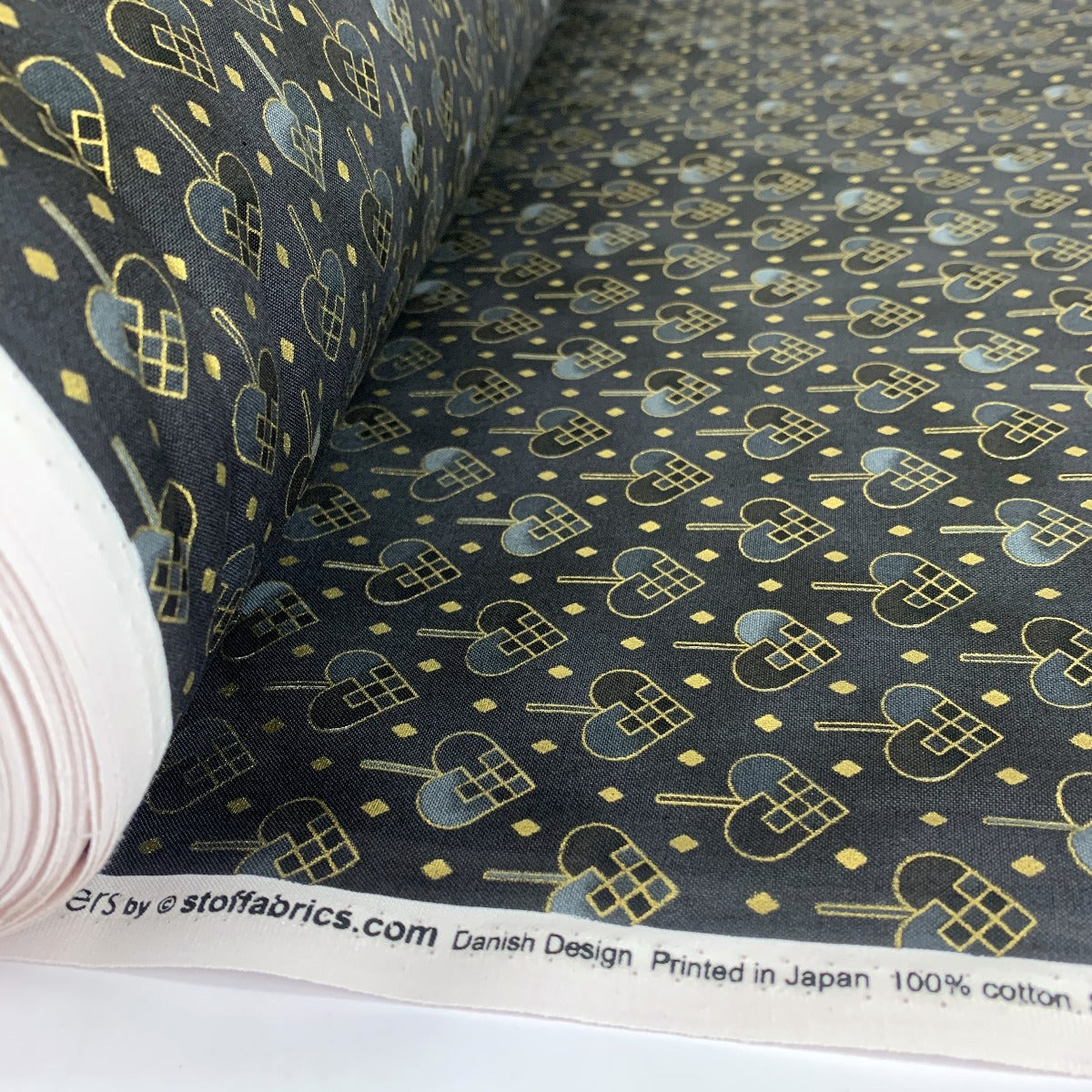 Designed in Denmark and printed in Japan. Superb quality Stof Japanese craft cotton with a print of gold diamonds and hearts on a black ground.