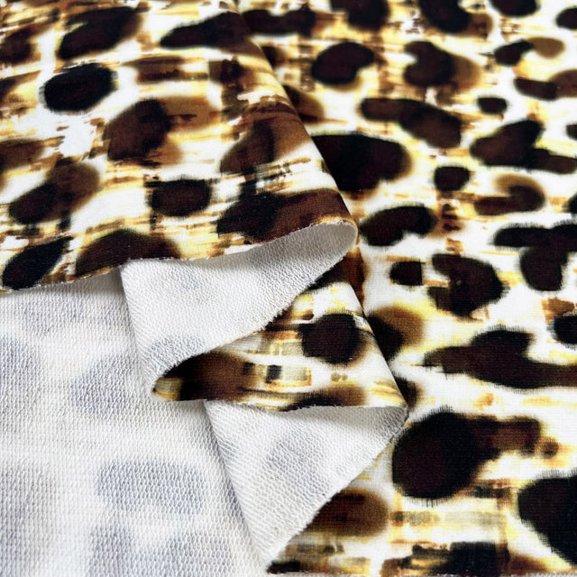 Introducing our French Terry knitted jersey fabric – a perfect blend of comfort and style. Made from 95% cotton and 5% elastane, this material is incredibly soft and versatile. Featuring an abstract leopard print made up of yellow, white and brown hues, our 150cm wide cloth is great for adding a touch of playfulness to your creations.