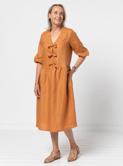 Choose between a “V” neck or a collar, and finish it off with your preferred front opening—buttons, button and loop fastening, or a soft tie front. The dress falls to mid-calf and includes discreet inseam pockets for added practicality. A small bust dart adds gentle shaping without over-complicating the fit.