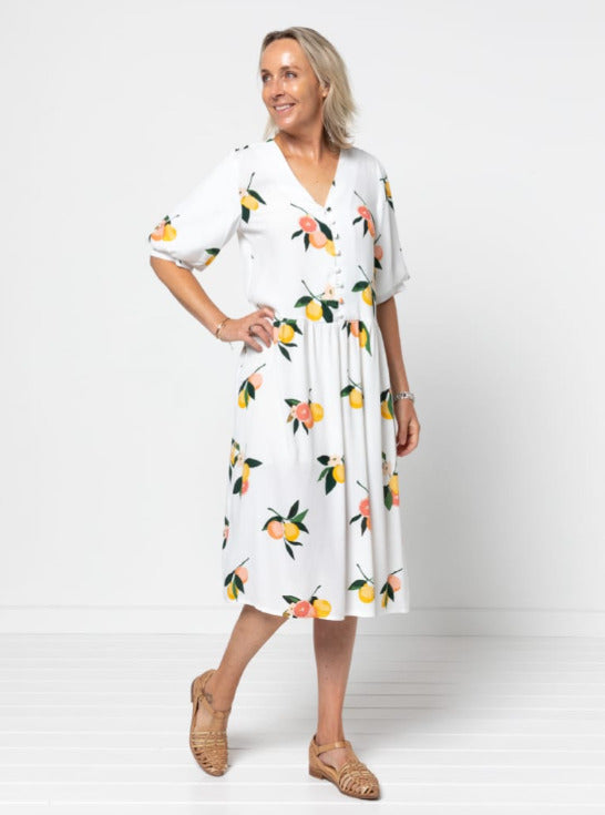 Introducing a versatile sewing pattern offering two key styles: a low-waisted dress with a gathered skirt, and a waist-length top. With four bodice and four sleeve options to mix and match, you can create a piece that suits your style—whether you prefer a sleeveless version with neat inside armhole binding or a more classic sleeve.