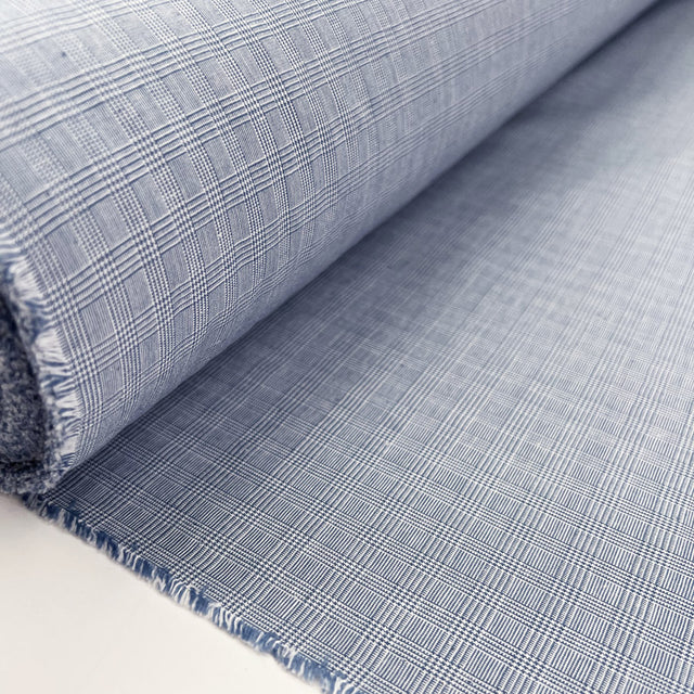 Made from 97% cotton and 3% elastane, this 150cm wide trousering fabric is ideal for the warmer months. This lightweight cloth features a delicate white check pattern set against a serene pale blue backdrop. The tiny checks add a touch of classic style without overpowering, making it a versatile choice for tailored trousers, shorts, or even lightweight blazers.