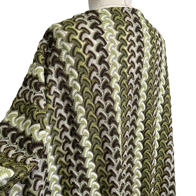 • 160cm wide, 100% polyester crochet lace fabric in earthy tones of green and brown.