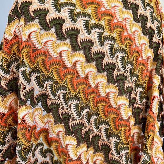 This elegant 100% polyester crochet lace fabric is a masterpiece of textile artistry, ideal for creating exquisite evening wear that commands attention. The intricate design offers a tapestry of colour in earthy tones that would enhance any garment with a touch of nature's charm. Weighing 208gsm, it strikes the perfect balance between delicate allure and substantial quality.