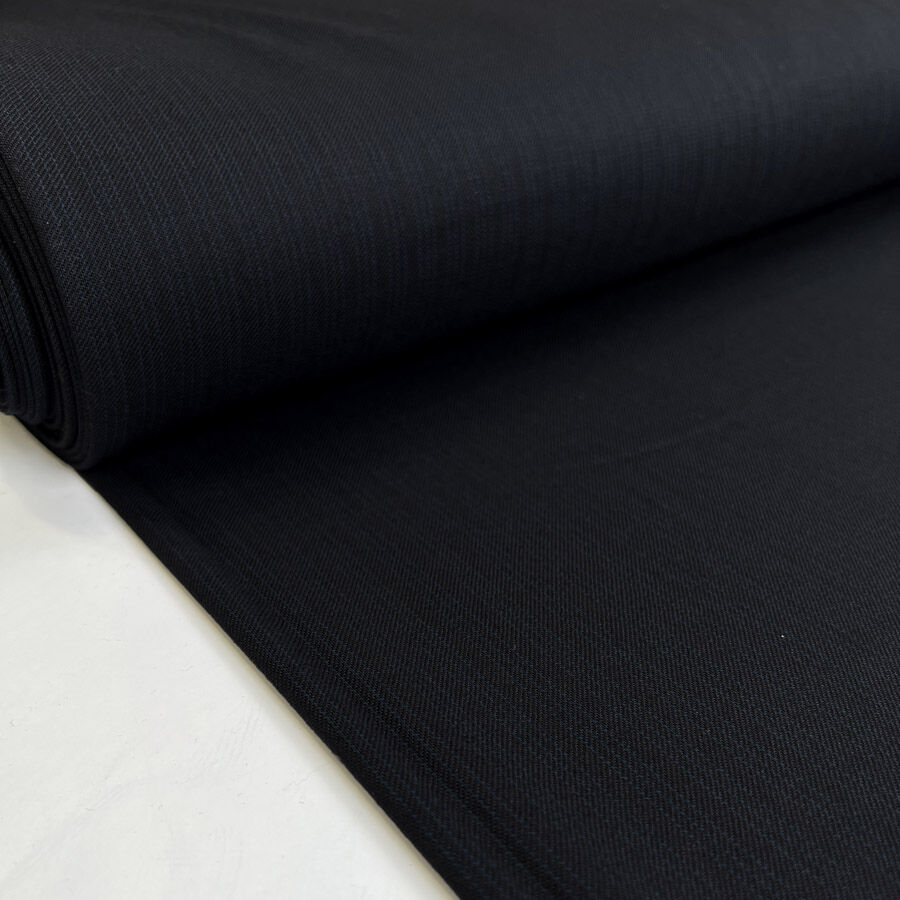 Refined and versatile, this dark navy wool blend suiting fabric features a fine blue check woven into its surface for a subtle, timeless finish. Made from 65% wool, 33% polyester, and 2% elastane, it combines natural softness with durability and a touch of stretch for comfort and ease of movement. At 153cm wide and 194gsm, it’s a lightweight suiting with a smooth drape—ideal for tailored jackets, trousers, skirts, and dresses with a classic yet modern edge.