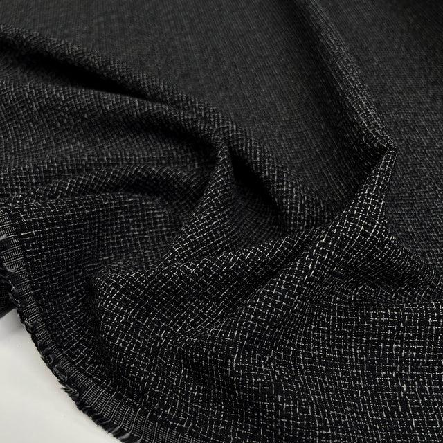 A lightweight woven cotton with a fine, tightly structured surface, featuring subtle white lines woven through a deep black base. The effect is understated and textural rather than patterned, giving the cloth a quiet depth that feels clean and modern rather than bold.