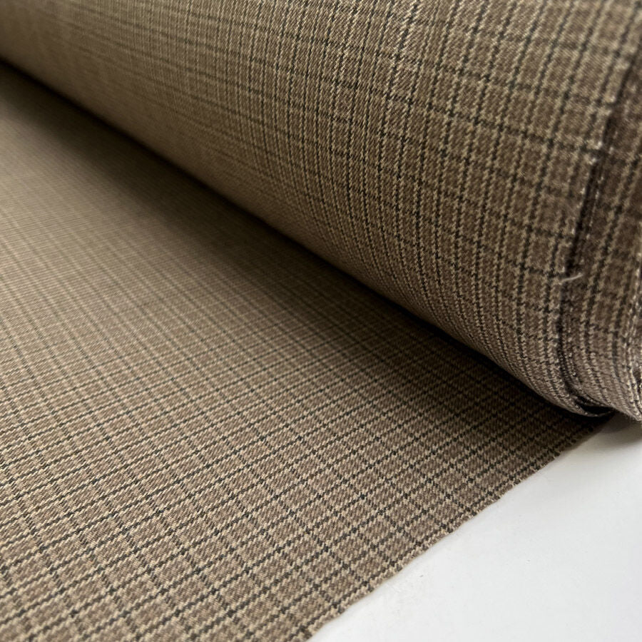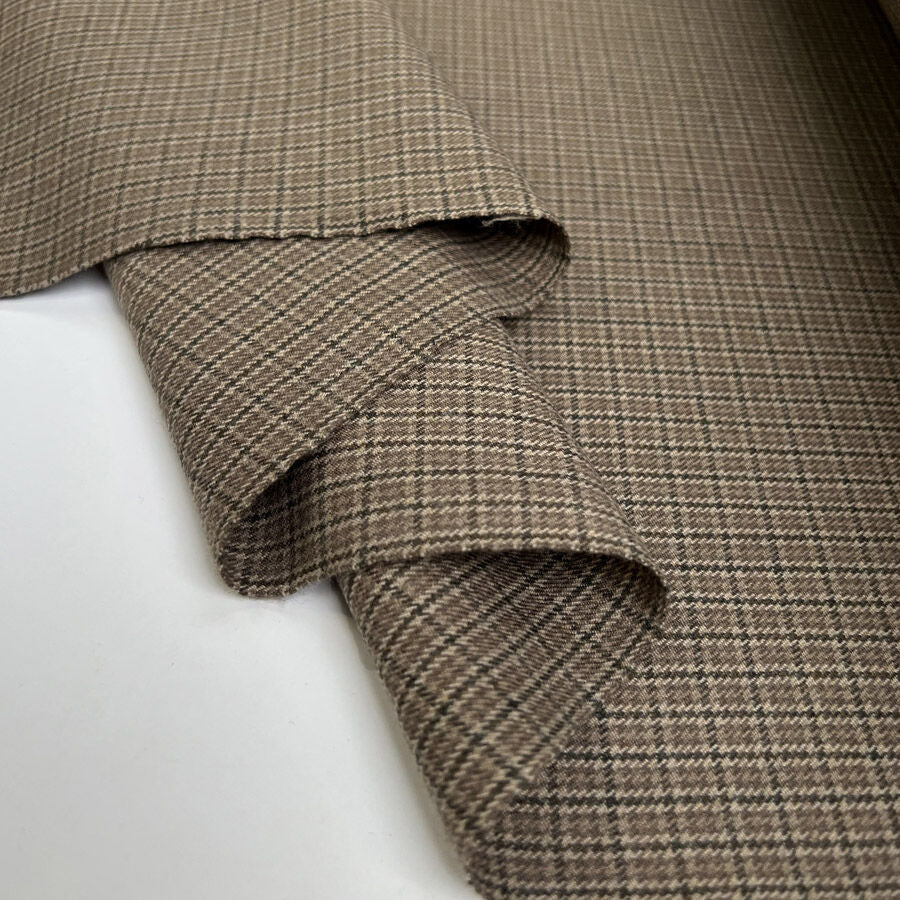 A beautiful 100% wool suiting fabric woven in a tiny check design of moss, almond, brown, and beige tones. With a soft, tactile finish and a medium-weight handle, this fabric offers warmth, structure, and a traditional look with a modern twist. Perfect for creating tailored jackets, skirts, and suits inspired by the countryside.