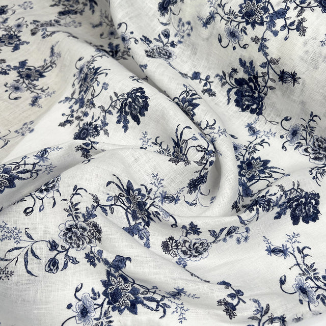 This 100% linen fabric features a delicate navy floral print on a crisp white background, bringing a timeless charm to any project. Light and breathable, it captures everything you love about pure linen — a soft handfeel, gentle drape, and natural texture that becomes even more beautiful with wear and washing. Perfect for creating elegant, easy-to-wear garments or refined home textiles.