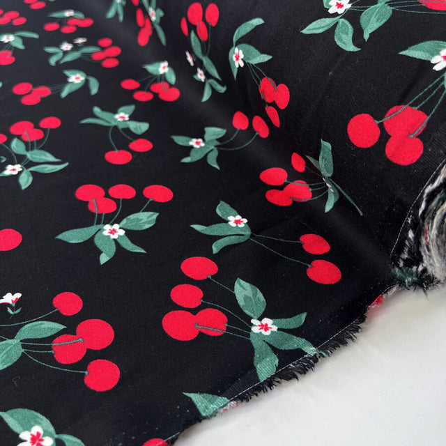 • Cute cherry print in a pinky red with green leaves on a black backdrop.