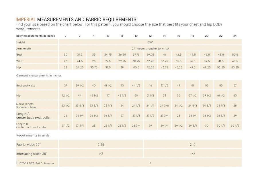Recommended fabrics: medium-weight woven fabrics such as denim, twill, corduroy, canvas, flannel, or light wool.