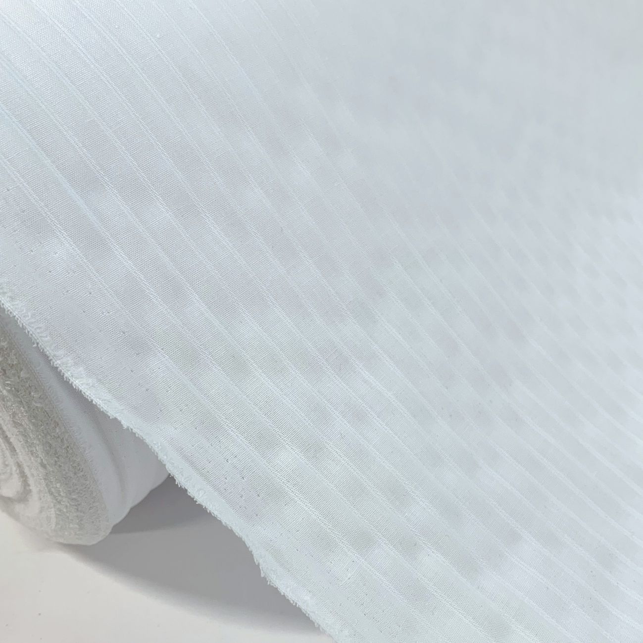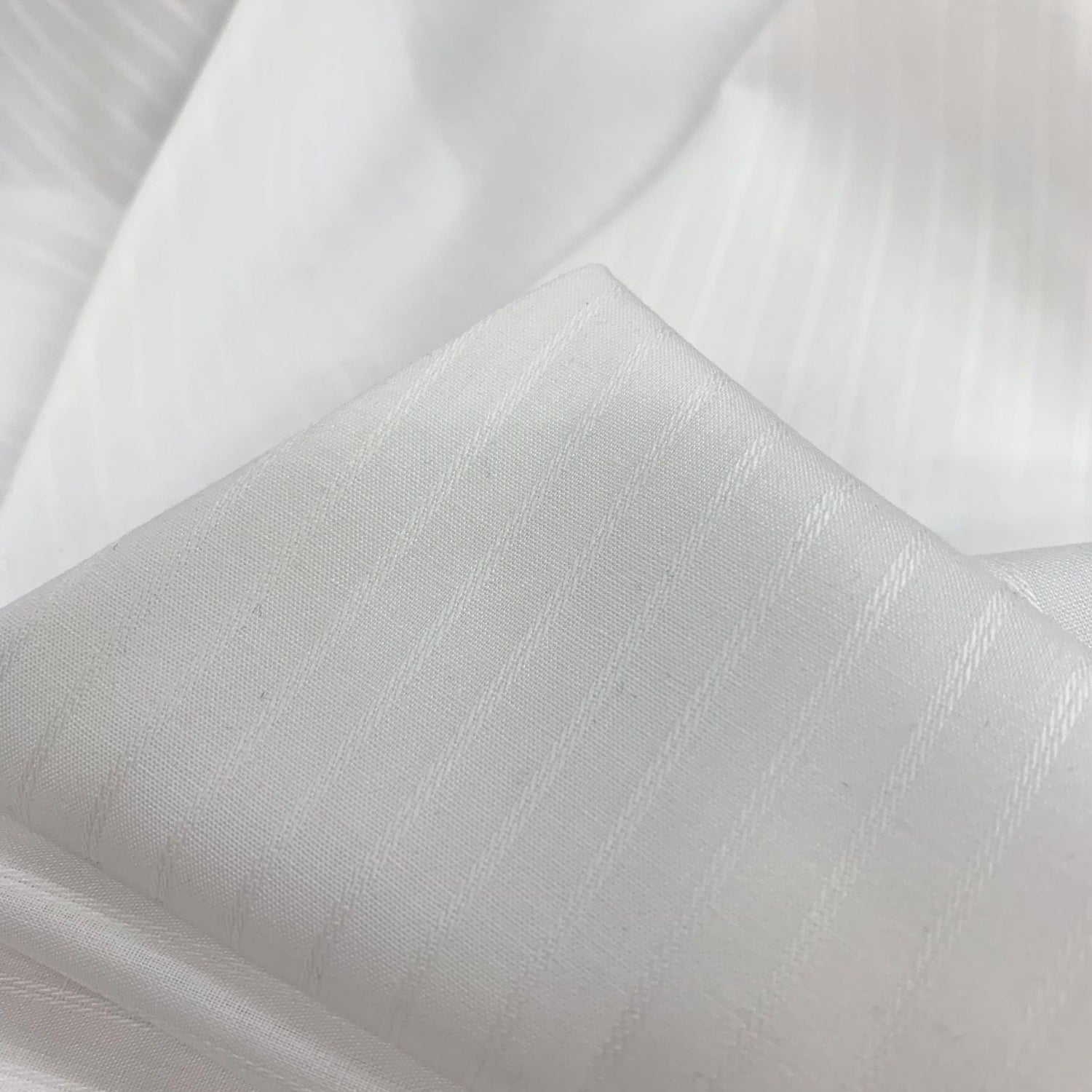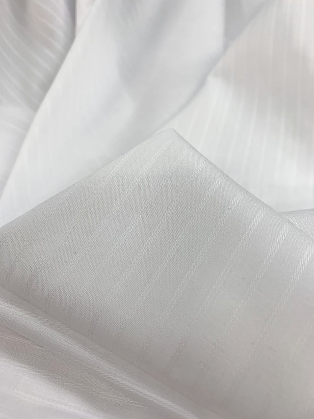 Incredibly fine poly/ cotton shirting in white with a double fine woven self coloured pinstripe. |