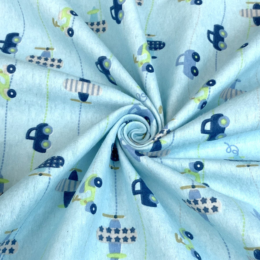 This playful blue winceyette fabric is 150cm wide and features a bold automobile print. Planes, cars and scooters decorate this soft brushed cotton fabric making it a brilliant choice for creating pyjamas and accessories for your little motor head in training.