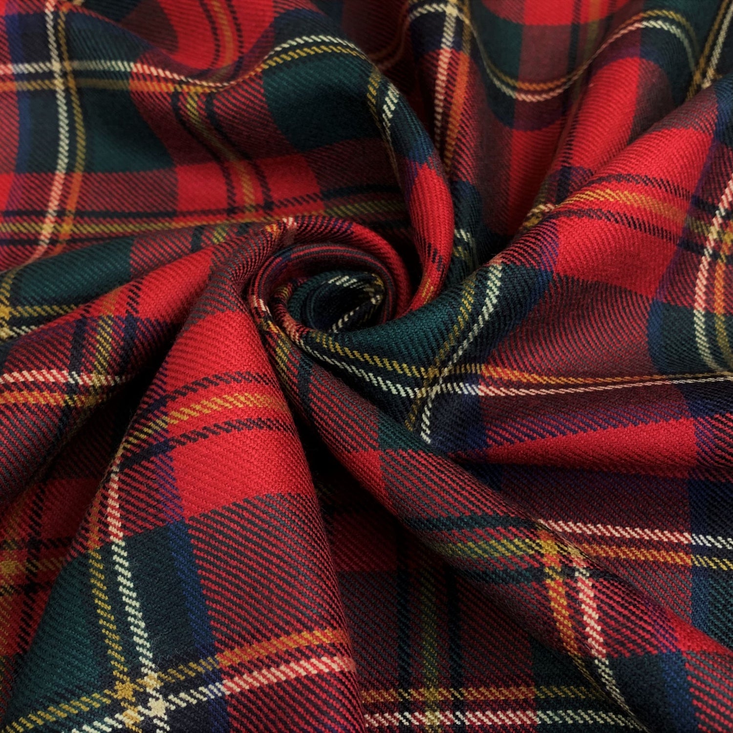 Made in Britain from 100% wool, this tartan patterned fabric in red features shades of green and blue. Perfect for trousers, skirts, suits and kilts!