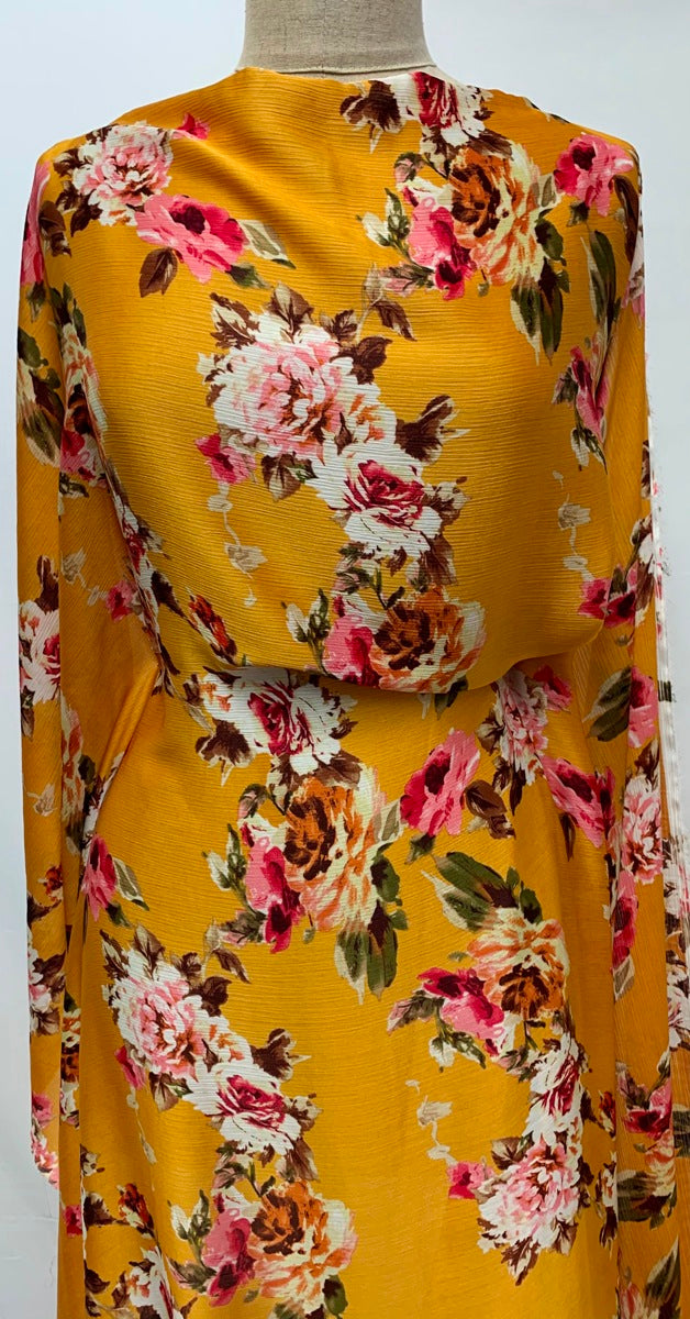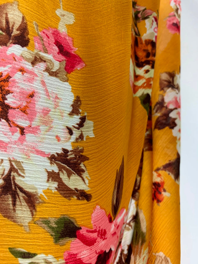 | A 150cm wide very delicate polyester chiffon in ochre with a pink floral design. The cloth is finished in a slight but positive wrinkle effect, which adds interest and character. This can be used for blouses, dresses and scarves and it also works well as an overlay. | |
